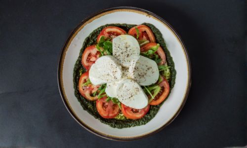 Fresh mozzarella, tomatoes with pesto, extra virgin olive oil