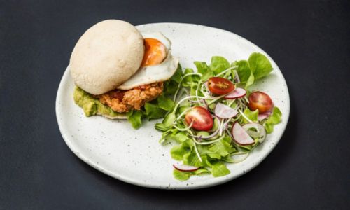 Fried marinated chicken, cheese, pickled red onion and cucumber, burger sauce, iceberg lettuce