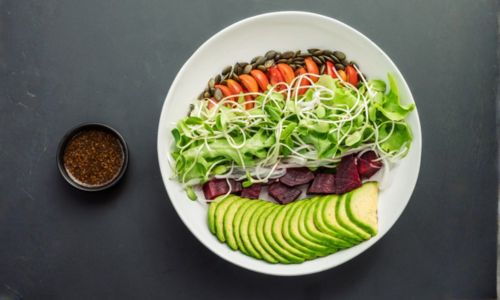Mixed lettuce, beetroot, avocado, cherry tomatoes, shallots, pickled papaya, pumpkin seeds served with sesame dressing