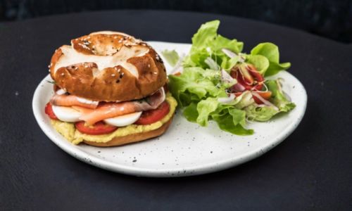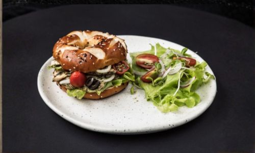 Grilled chicken, pesto sauce, Kalamata olives, tomato confit, red onion, lettuce, mayonnaise served in a bretzel bagel