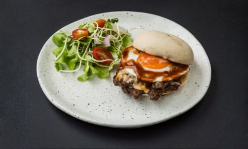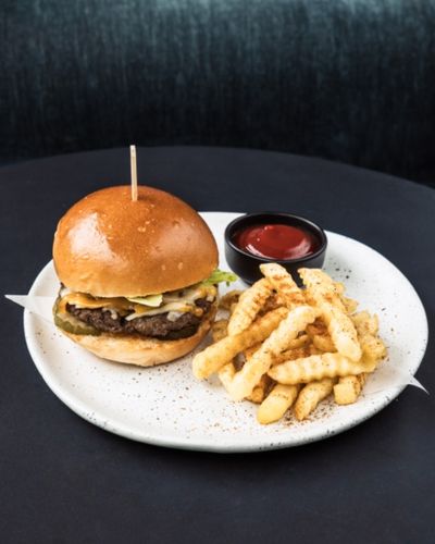 Wagyu beef patty, Emmental cheese, burger sauce, pickled cucumber, caramelized onions, iceberg lettuce
